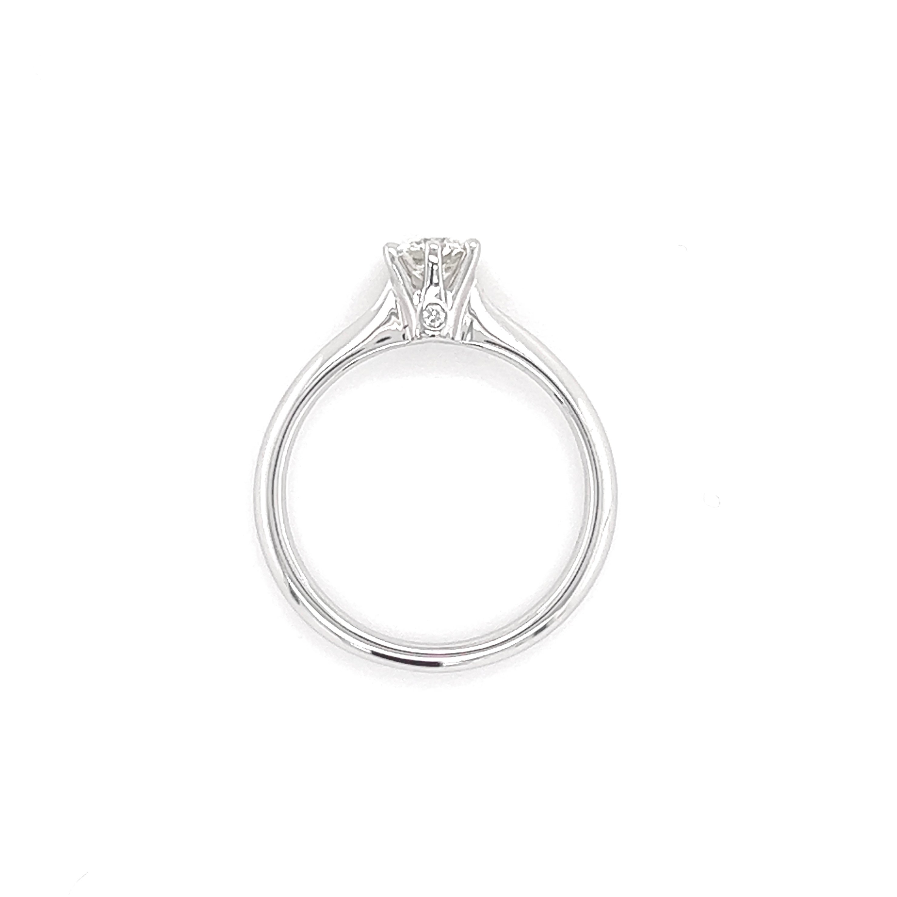 Diamond weighted 0.31 carat, J colour, VVS1 with GIA certificate. Beautifully set in 18K white gold classic six prongs ring.