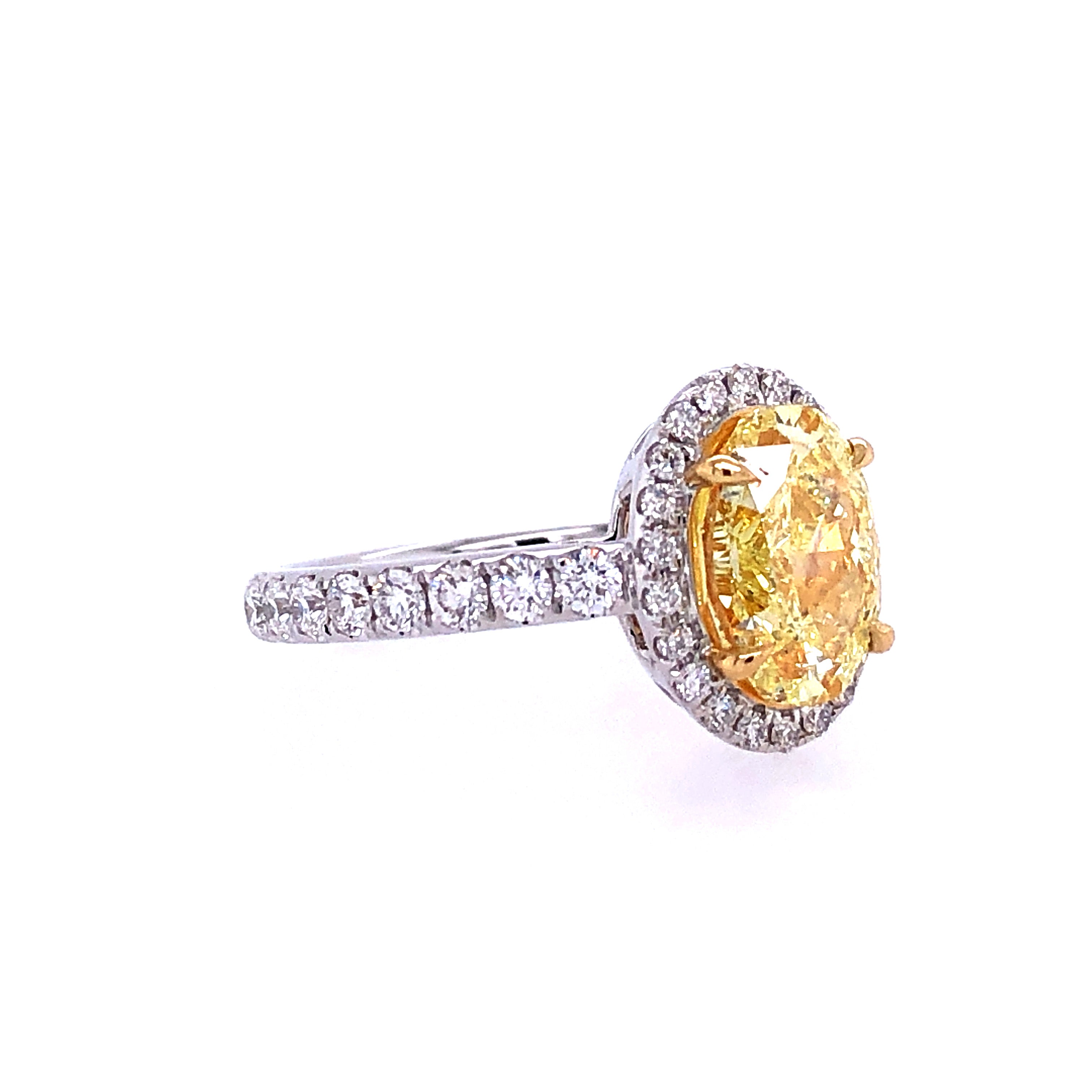 Oval Shaped natural Fancy Yellow Diamond elegantly set in 18K white gold and white diamonds ring, the fancy yellow diamond weight 2.01 carat.